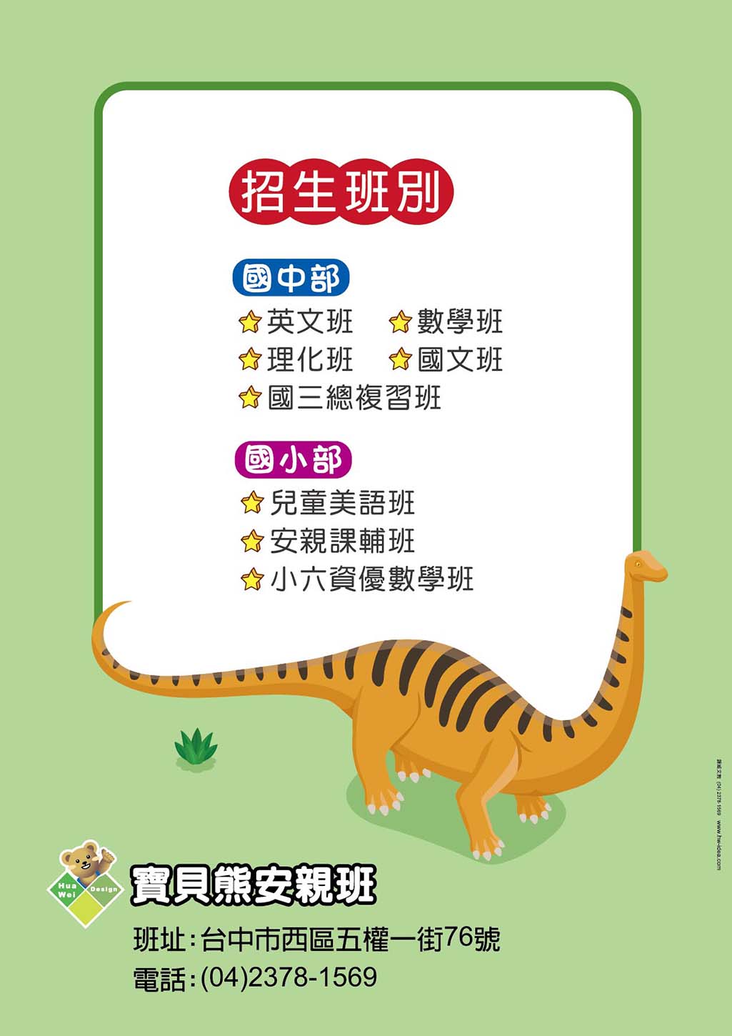 公版內的文字內容皆可修改,位置也可調動,可放上補習班名稱、LOGO、電話、地址、招生班別........等資訊