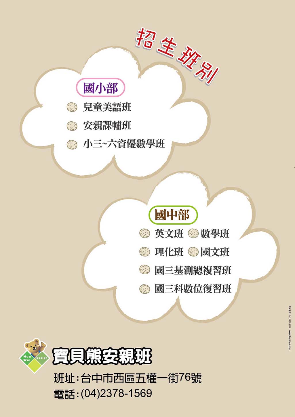 公版內的文字內容皆可修改,位置也可調動,可放上補習班名稱、LOGO、電話、地址、招生班別........等資訊
