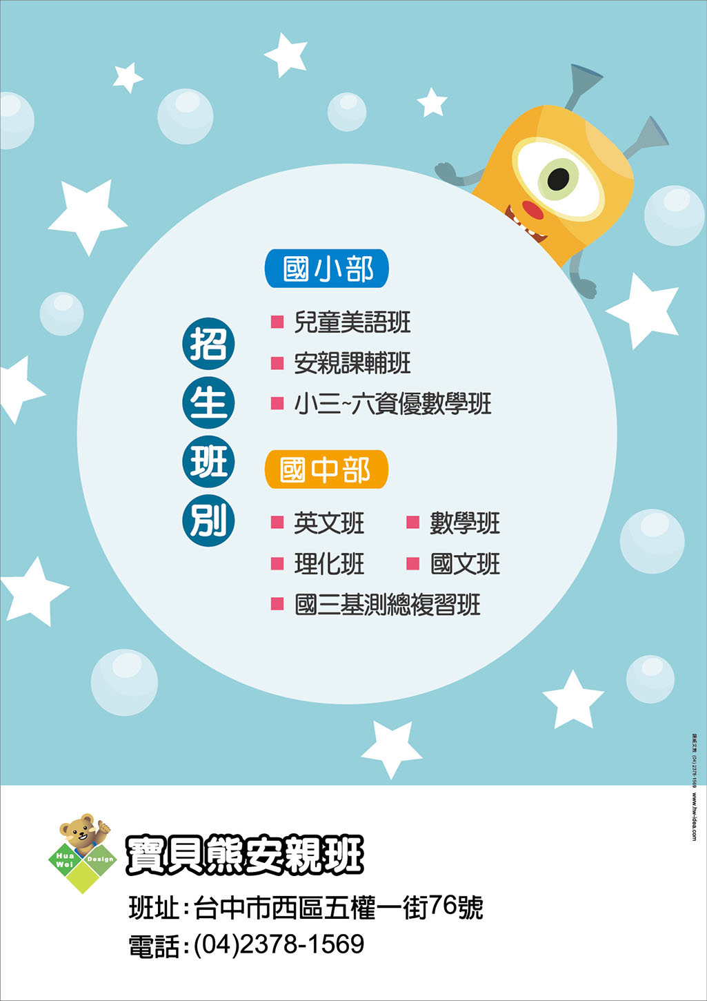 公版內的文字內容皆可修改,位置也可調動,可放上補習班名稱、LOGO、電話、地址、招生班別........等資訊