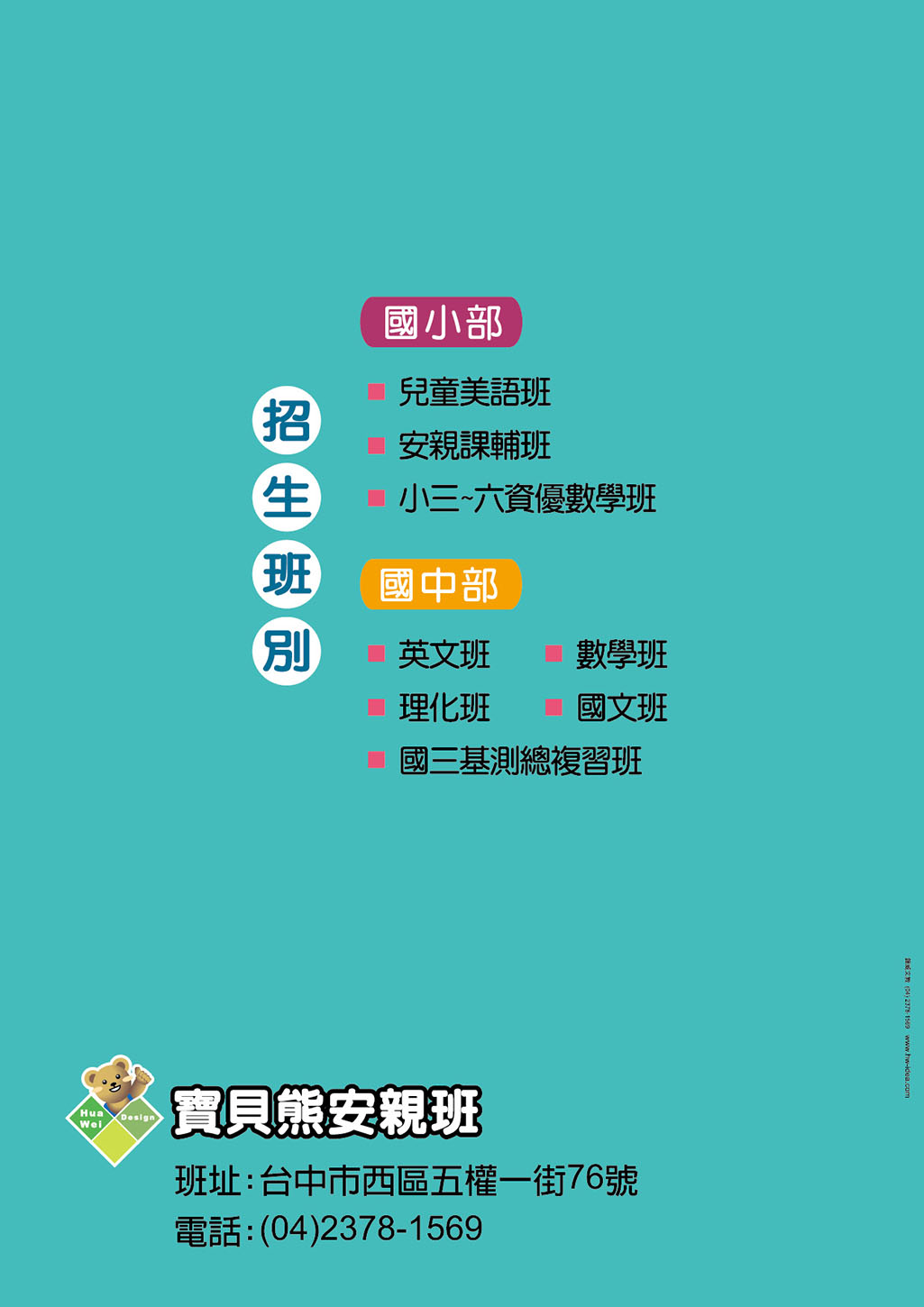 公版內的文字內容皆可修改,位置也可調動,可放上補習班名稱、LOGO、電話、地址、招生班別........等資訊