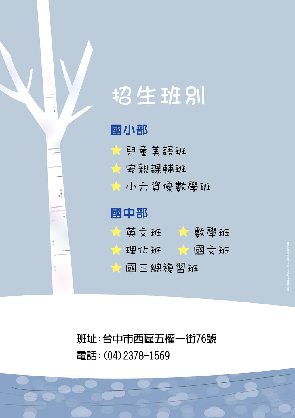 公版內的文字內容皆可修改,位置也可調動,可放上補習班名稱、LOGO、電話、地址、招生班別........等資訊
